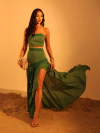 Este vestido fluido apresenta um design exclusivo com recortes estratégicos na cintura, que valorizam a silhueta, e é confeccionado sem alças, proporcionando um visual clean e moderno.
