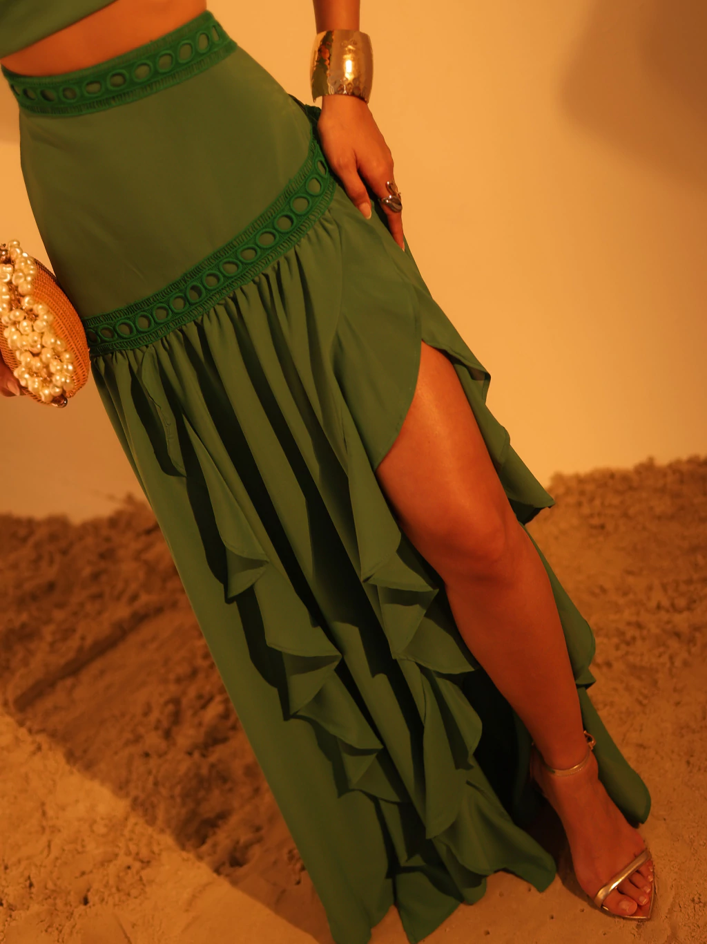 A saia é toda adornada com babados delicados que garantem movimento e leveza a cada passo, enquanto a fenda traz um toque de ousadia sutil.