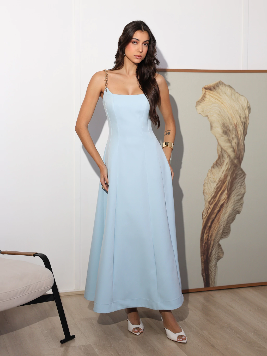 Um vestido que une elegância e modernidade em cada detalhe, com modelagem midi que valoriza a silhueta, ele traz como destaque as alças em corrente dourada, que adicionam sofisticação e um toque de estilo único na peça. Confeccionado em alfaiataria, com caimento impecável, ideal para ocasiões especias quanto para composições mais casuais e estilosas.